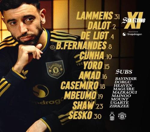 曼联首发:31-拉门斯、2-达洛特、23-卢克-肖、15-约罗、4-德利赫特、18-卡塞米罗、8-布鲁诺-费尔南德斯、16-阿马德-迪亚洛、10-马特乌斯-库尼亚、19-姆伯莫、30-谢什科