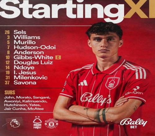 诺丁汉森林首发:26-泽尔斯、3-内科-威廉斯、31-米伦科维奇、5-穆里略、37-萨沃纳、7-赫德森-奥多伊、8-埃利奥特-安德森、10-吉布斯-怀特、12-道格拉斯-路易斯、14-恩多耶、19-伊戈尔-热苏斯
