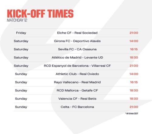 2025/26赛季西甲联赛赛程已近三分之一,第12轮争夺即将打响。本轮多场对决颇具看点,尤其皇家马德里与巴塞罗那双双客场作战,挑战重重。