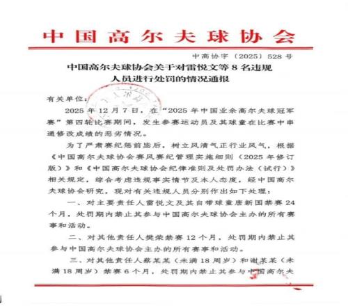 12月19日宣 中国高尔夫球协会发布情况通报,在“2025年中国业余高尔夫球冠军赛”第四轮比赛期间,发生参赛运动员及其球童在比赛中串通修改成绩的恶劣情况,对涉事人员处以最高禁赛2年的处罚。